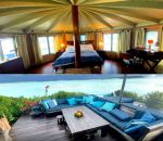 The outdoor space also features a seating area under a sheltered gazebo structure. The perfect retreat at the height of daytime sun.