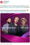 “From Apple Music With Love” returns during the week of Nov 25-30, when each day at 8 a.m. PT, subscribers to the service will receive exclusive gifts — ranging from live recordings, new versions of favorite songs, a classic album rerelease alongside a brand new holiday album, and mixes — from Sam Smith, Shania Twain, John Legend, DJ Khaled, Harry Connick Jr. and, to kick off the series today, a Boiler Room set from British electronic ace Fred Again.